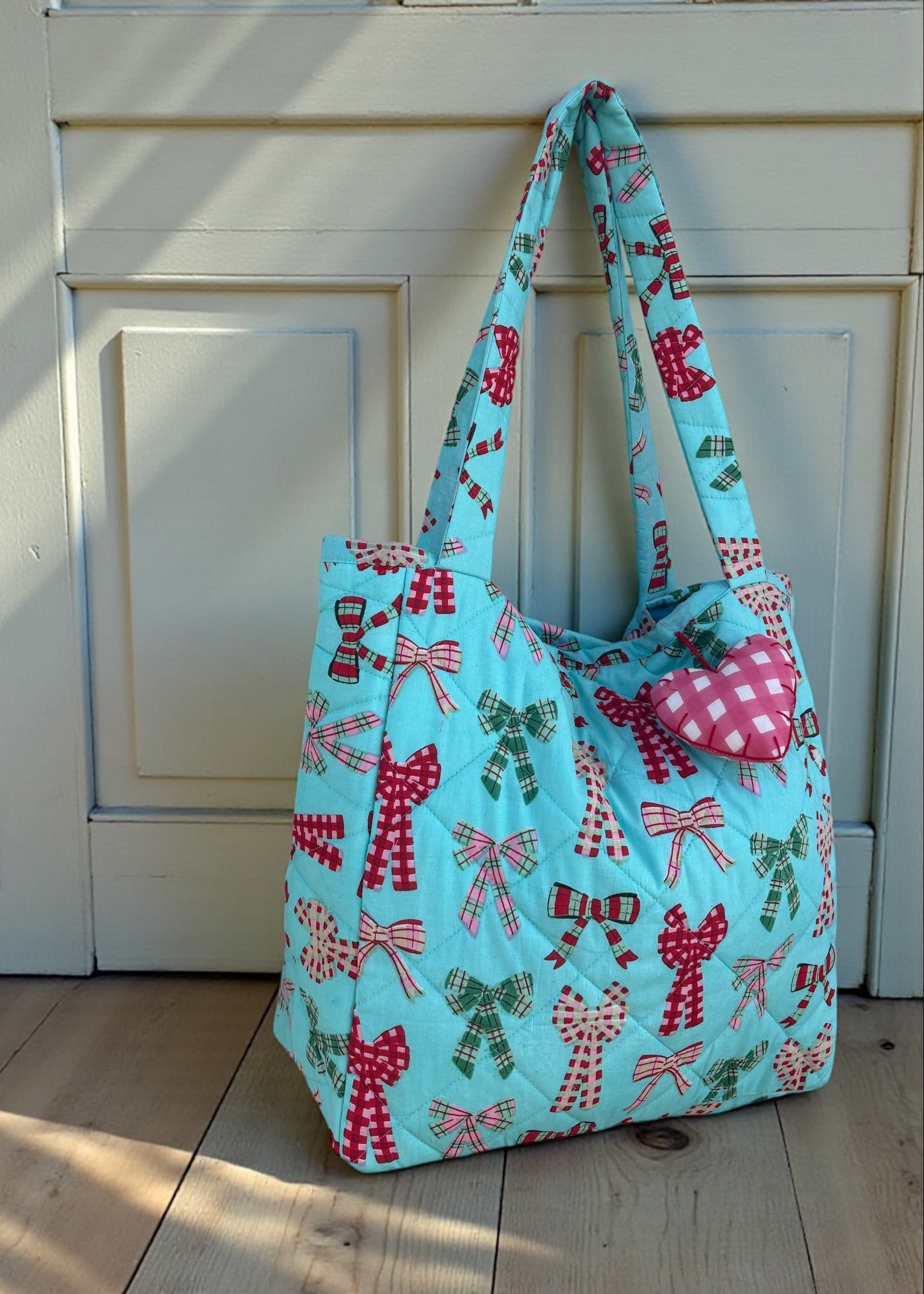 This handcrafted tote is made from premium quilted cotton in a refreshing aqua-blue tone, featuring an all-over bow print in contrasting colors. Accented with a padded heart charm and finished with long shoulder straps, it offers generous storage space while remaining lightweight and comfortable for everyday use.