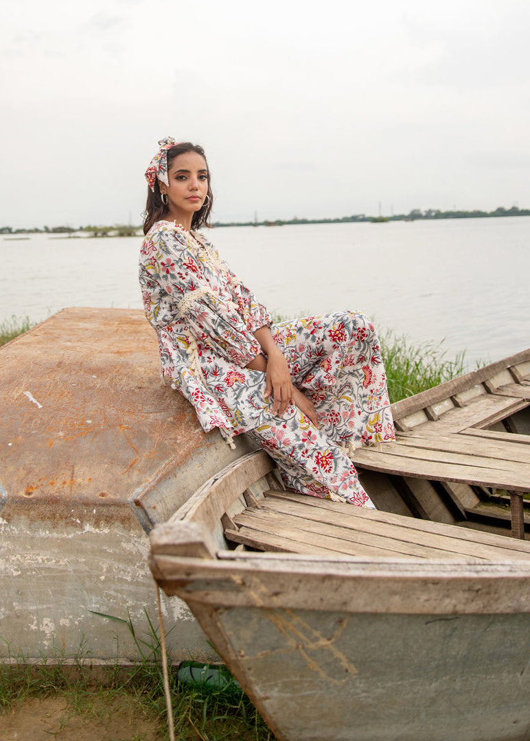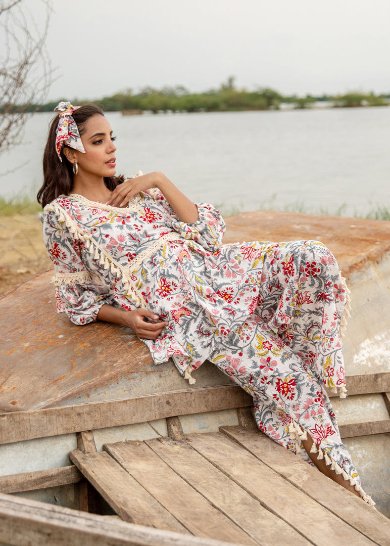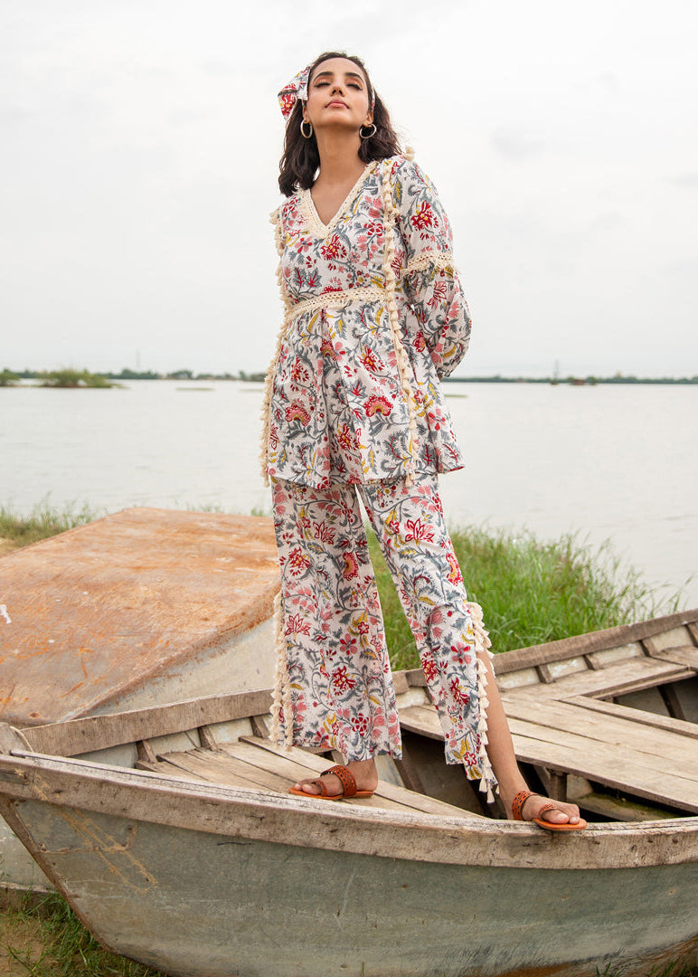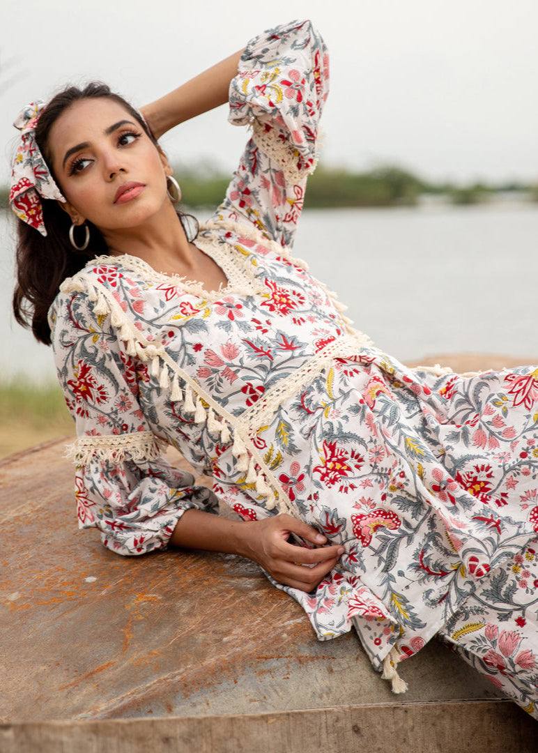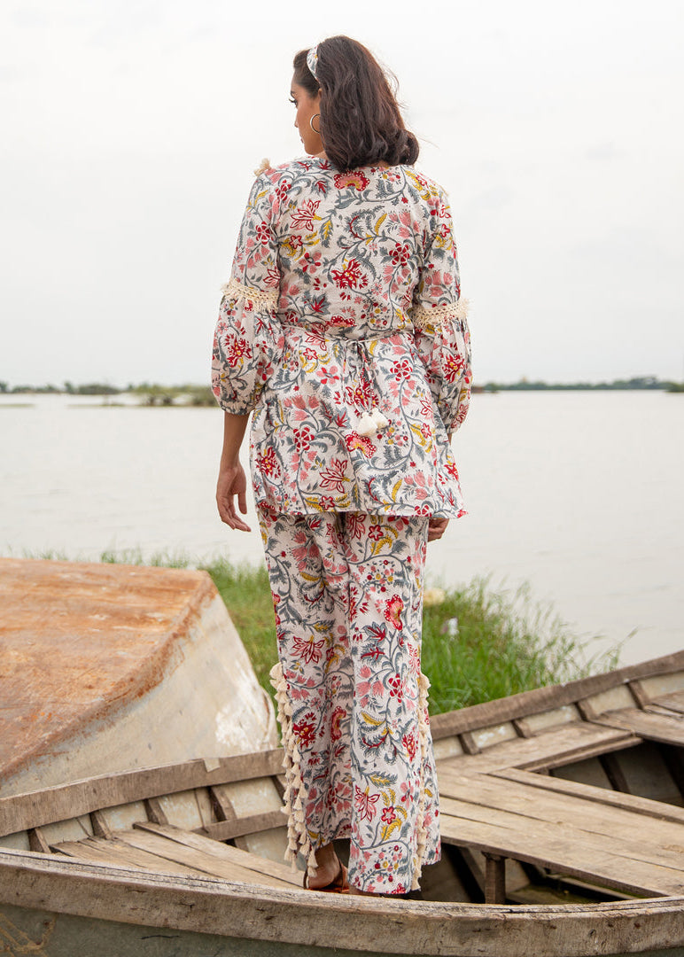 Crafted from soft organic cotton and adorned with intricate hand block prints, this two-piece set features a relaxed short kurta with cotton fringe accents and a delicate tie-up at the back. The matching flared pants include playful side slits with tassel detailing for added movement and charm.