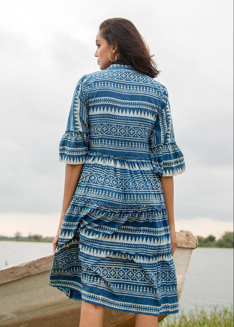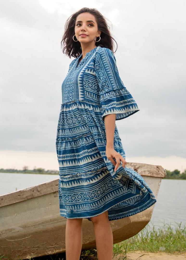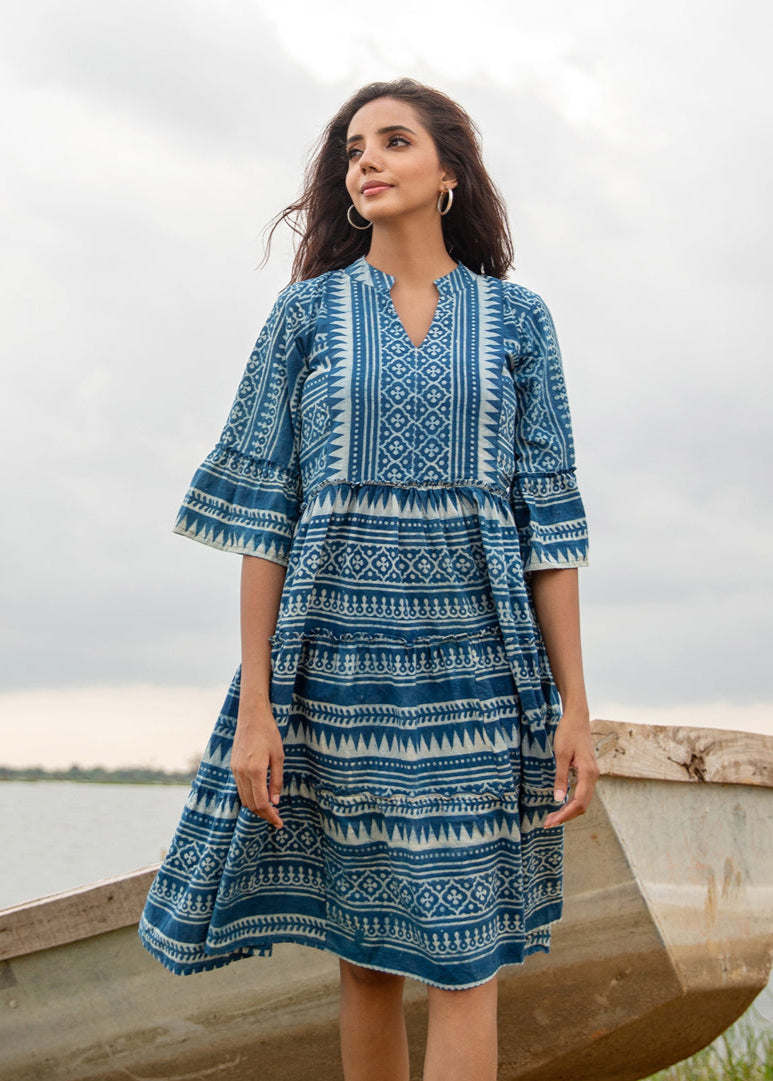 Crafted from breathable organic cotton and hand block printed in rich indigo tones, this knee-length dress is all about ease and effortless elegance. Whether you're stepping out for errands or lounging at home, Atea offers relaxed charm in a timeless silhouette.