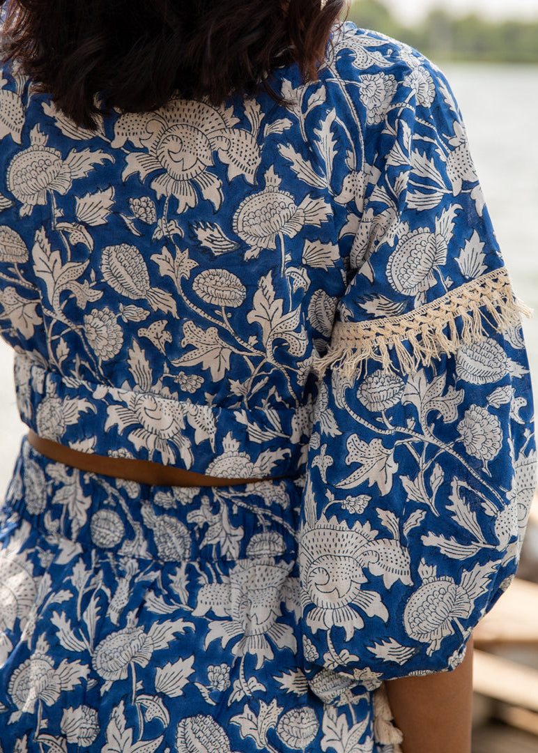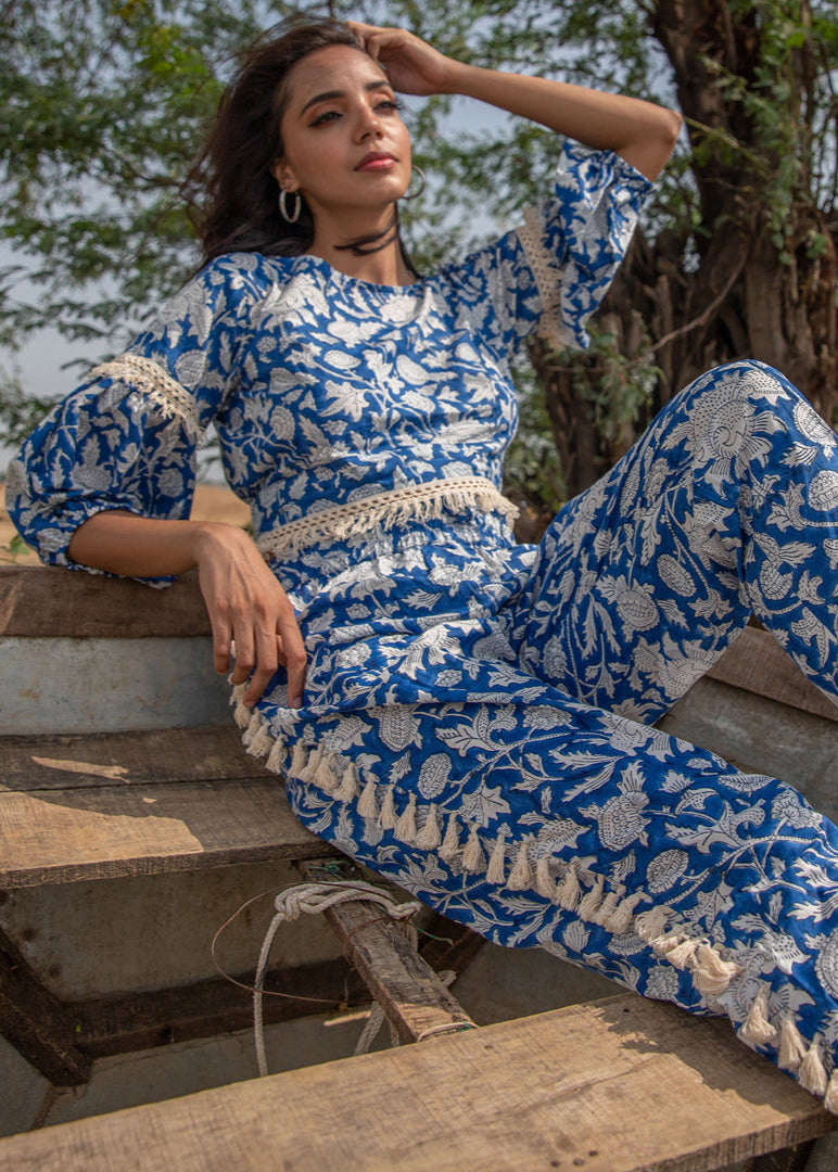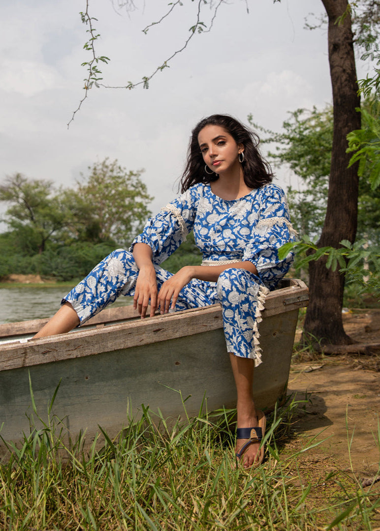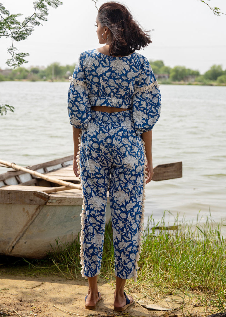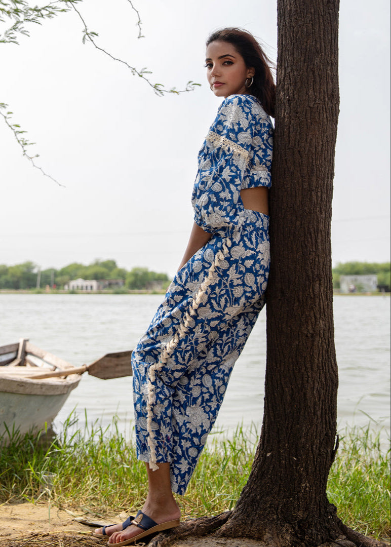 The Azora co-ord set is a poetic blend of elegance and ease, crafted in breathable organic cotton with traditional hand block printed florals. The crop top features a charming fringe lace detail, while the relaxed-fit pants are finished with playful tassel trims along the sides — a subtle nod to carefree days and soft silhouettes.