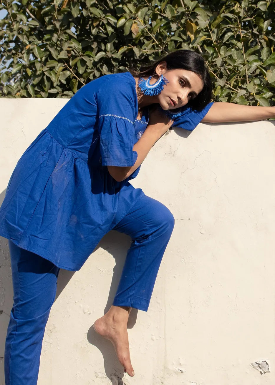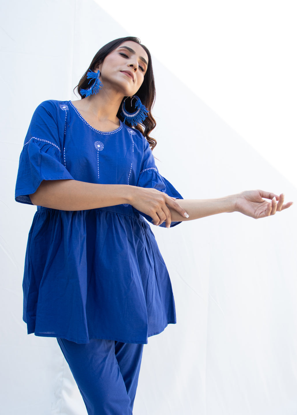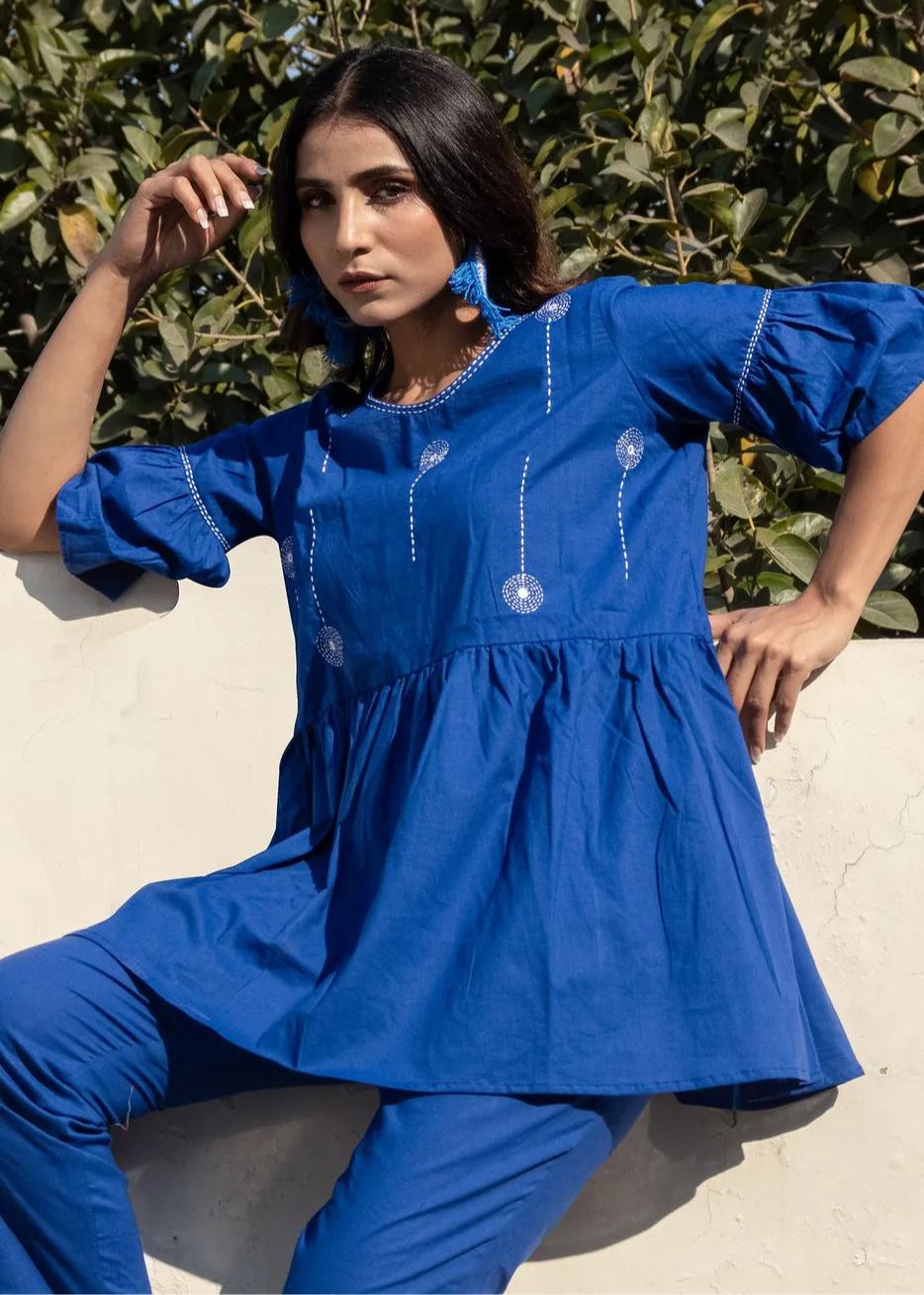 Let the vibrant blue do the talking — soft yet striking, BIA features minimal white Katha embroidery that gives it a clean, artisanal edge. With its flattering empire waistline, flared sleeves, and straight pants, this set is equal parts relaxed and radiant.