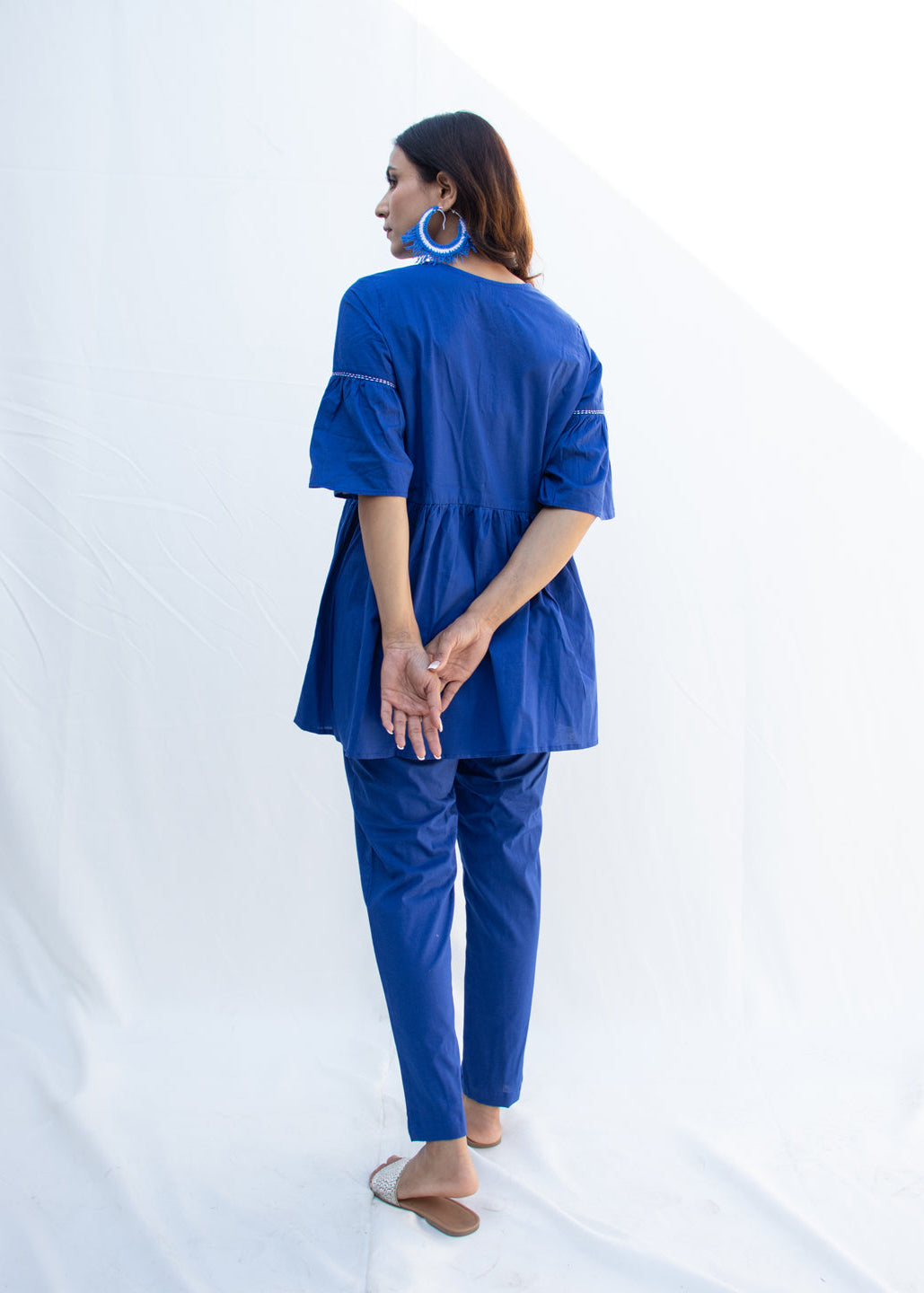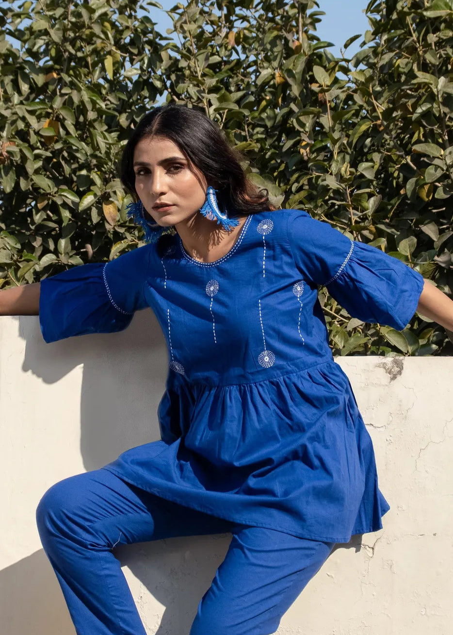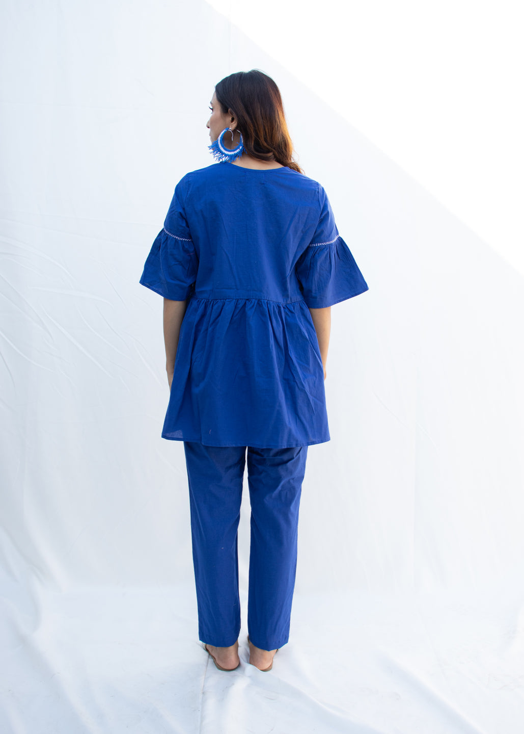 Let the vibrant blue do the talking — soft yet striking, BIA features minimal white Katha embroidery that gives it a clean, artisanal edge. With its flattering empire waistline, flared sleeves, and straight pants, this set is equal parts relaxed and radiant.