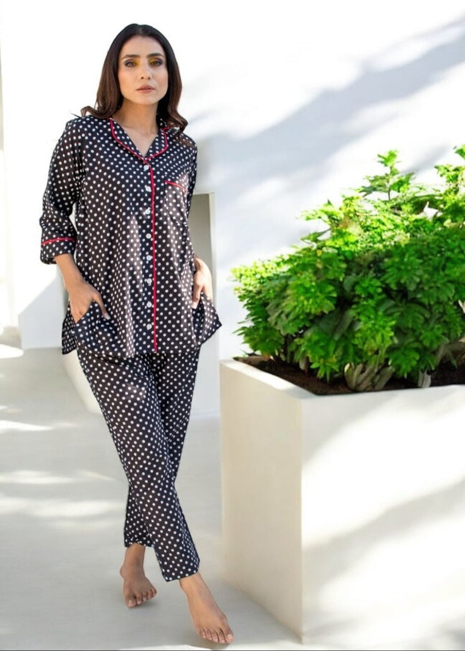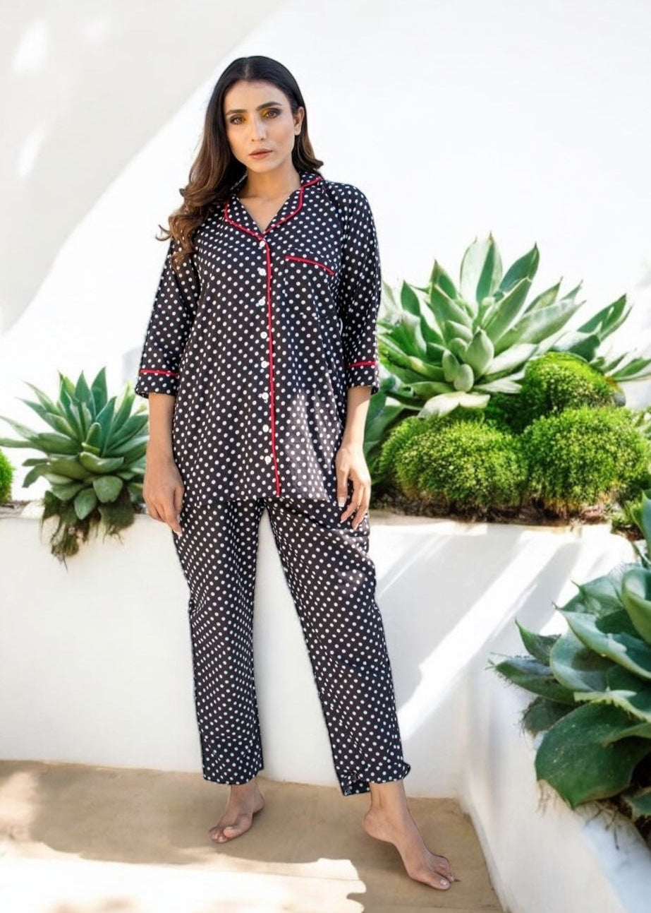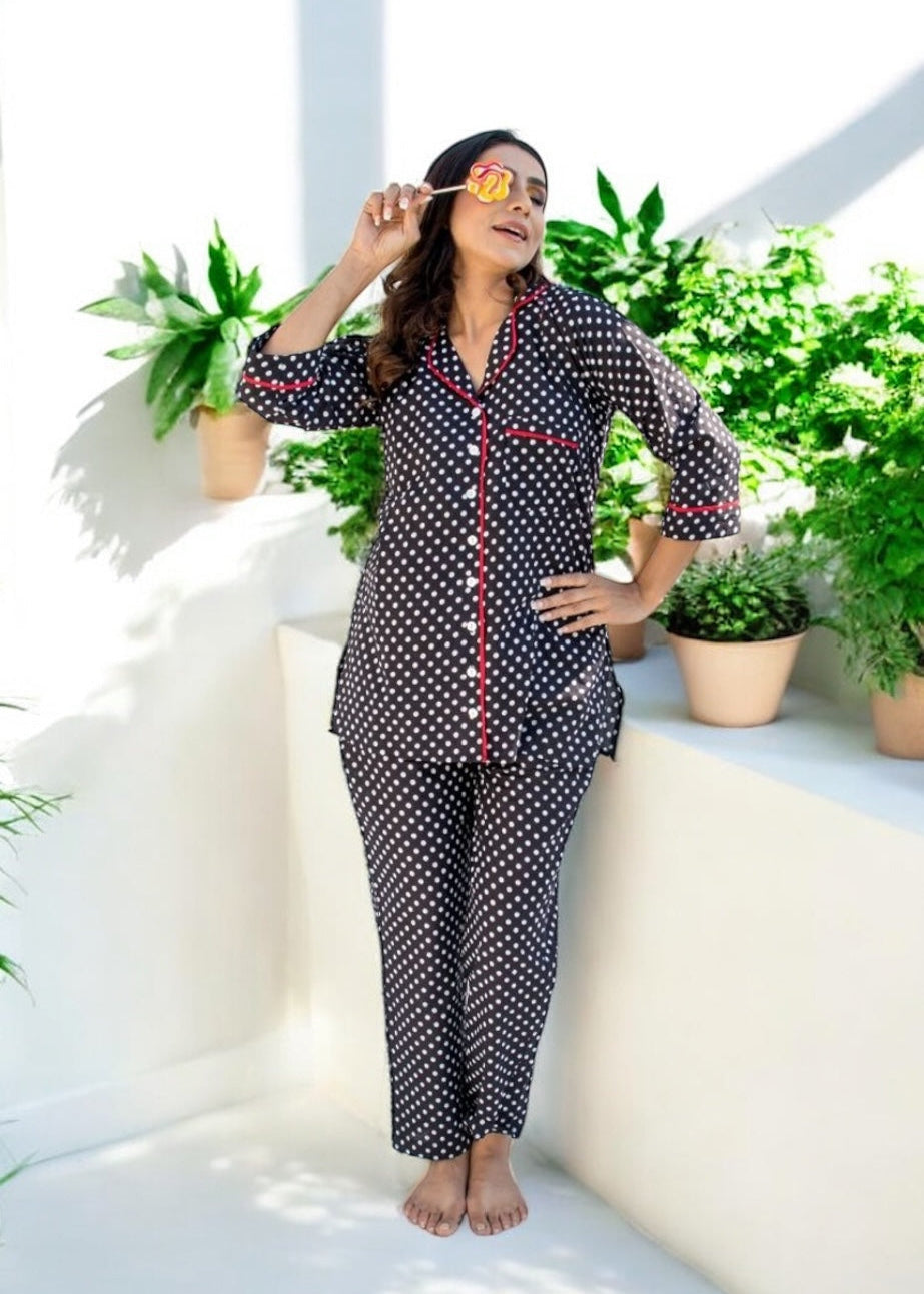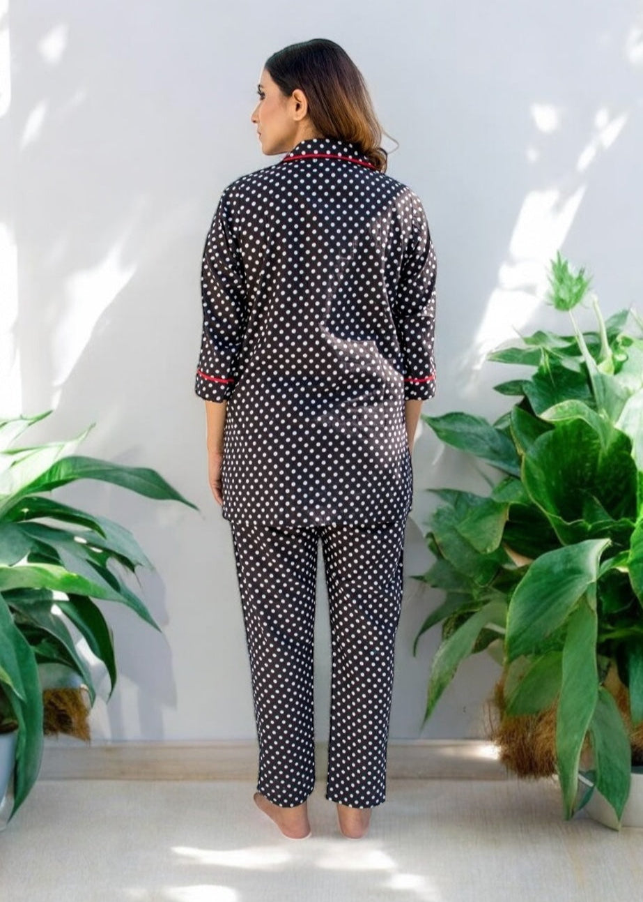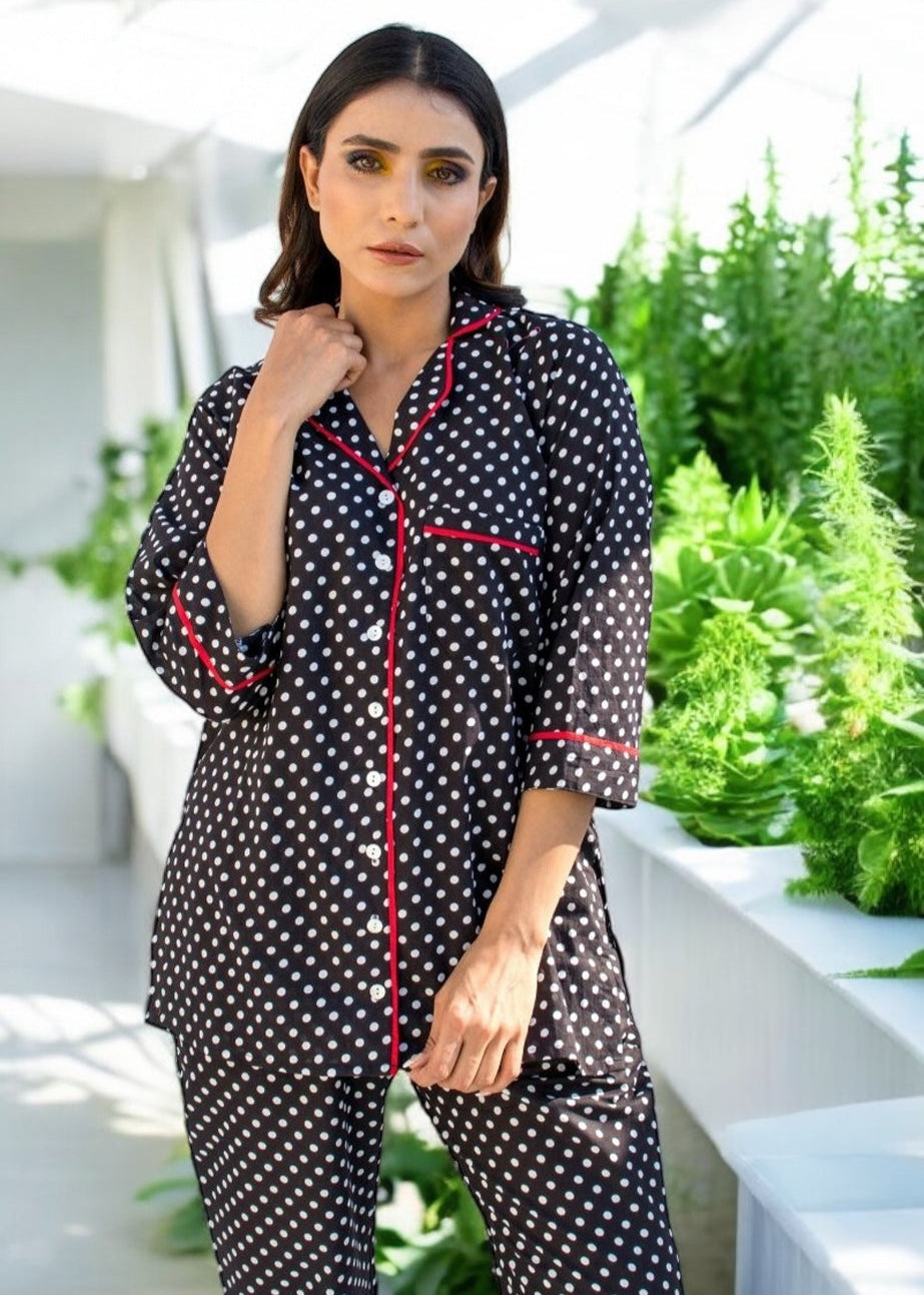 The Black Forest Co-ord Set brings a timeless twist to your downtime wardrobe. Crafted in breathable 100% cotton, this set features a relaxed shirt and straight-fit pants in charming black-and-white polka dots—accented with red piping for just the right pop of play.