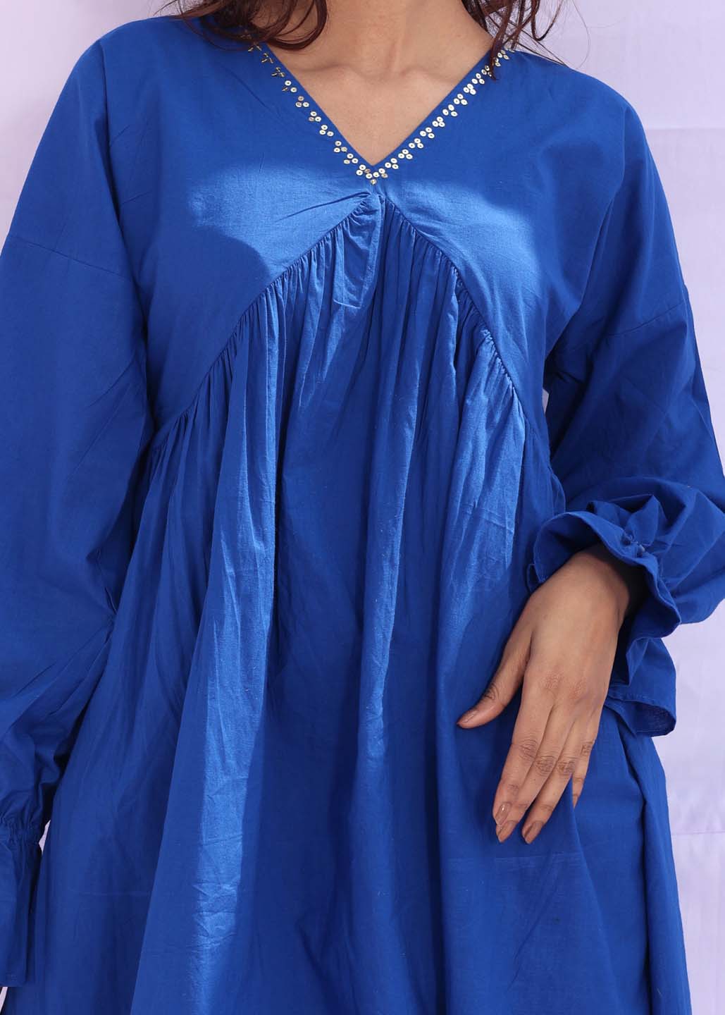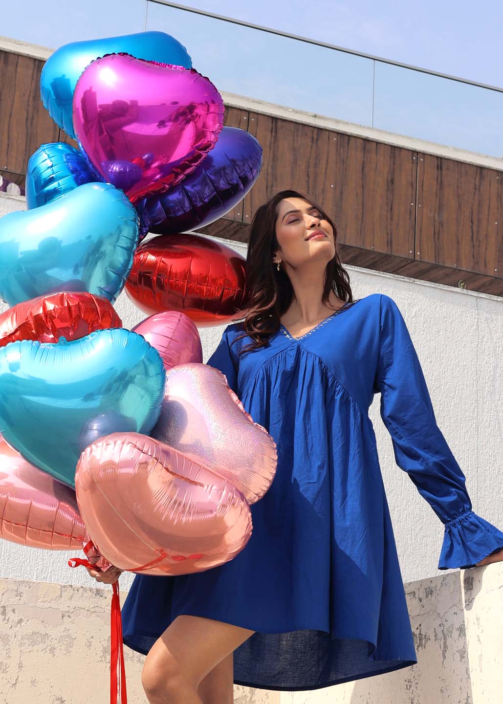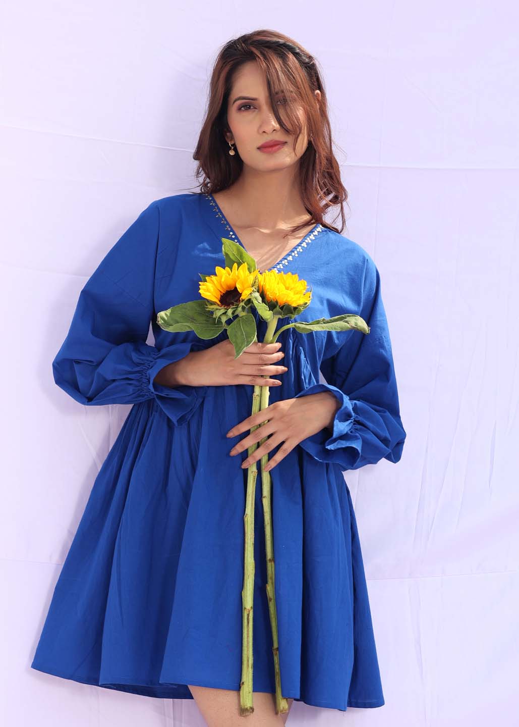 Embrace effortless elegance with our handcrafted Cotton Blue Flare Dress. Designed for modern women, this breathable cotton dress features a chic V-neckline with delicate embellishments that enhance your silhouette, while intricate handwork adds a touch of sophistication. The flattering flare design and voluminous balloon sleeves ensure graceful movement, making it an ideal choice for casual outings, brunches, or special occasions.
