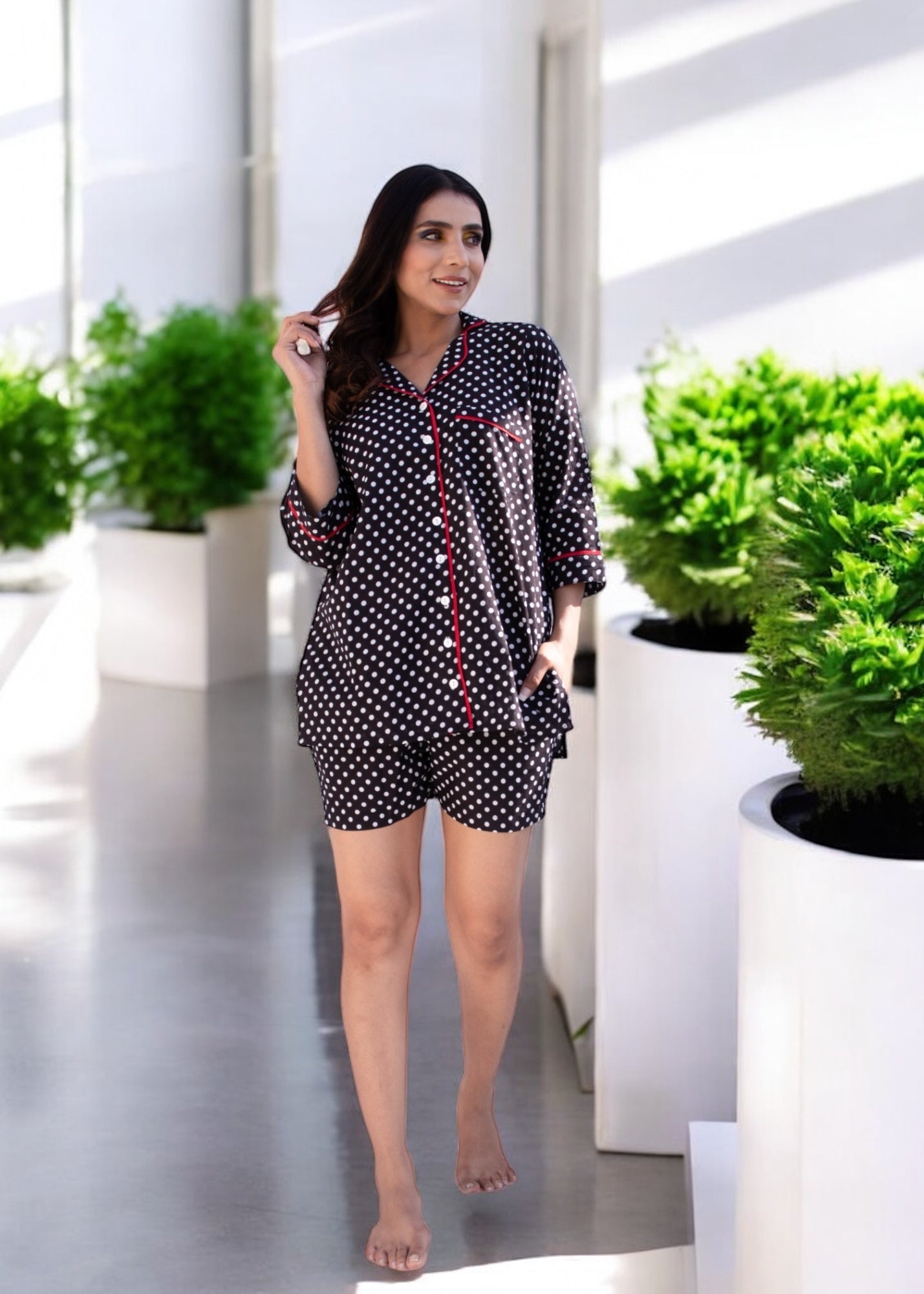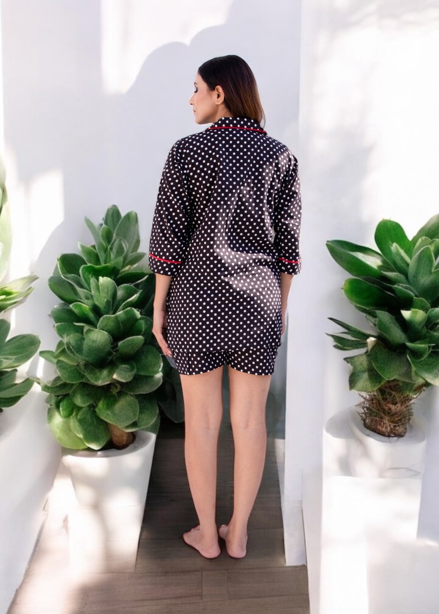 The Delight Co-ord Set is the flirty, feel-good essential your lounge drawer’s been waiting for. Made with 100% breathable cotton, this easy-fit shirt and shorts combo is sprinkled with classic white polka dots on a black base—finished with a playful red trim.
