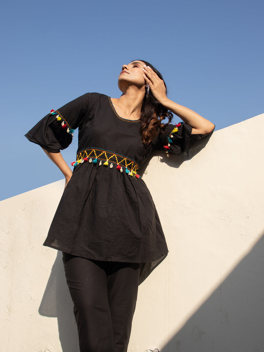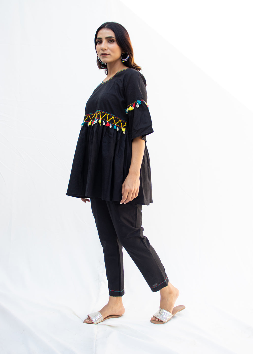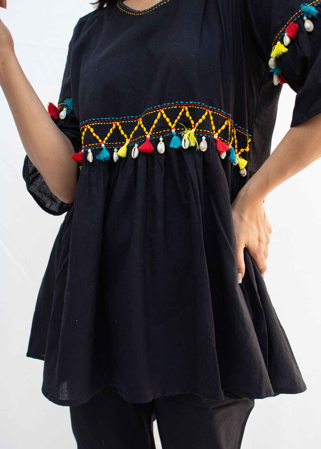 Made from 100% breathable cotton, NYAH features an empire-line kurta with hand-done Katha embroidery, colorful dori work, and joyful kodi tassel detailing across the front and sleeves. The flared cut of the top paired with relaxed-fit pants makes this set as comfy as it is captivating.