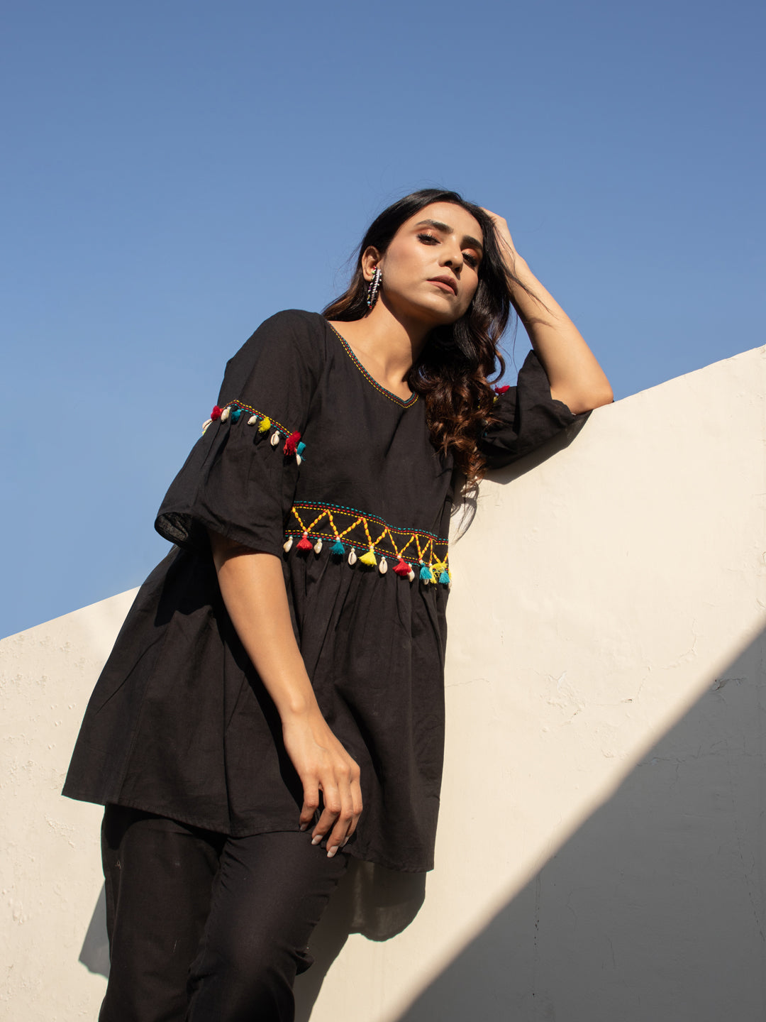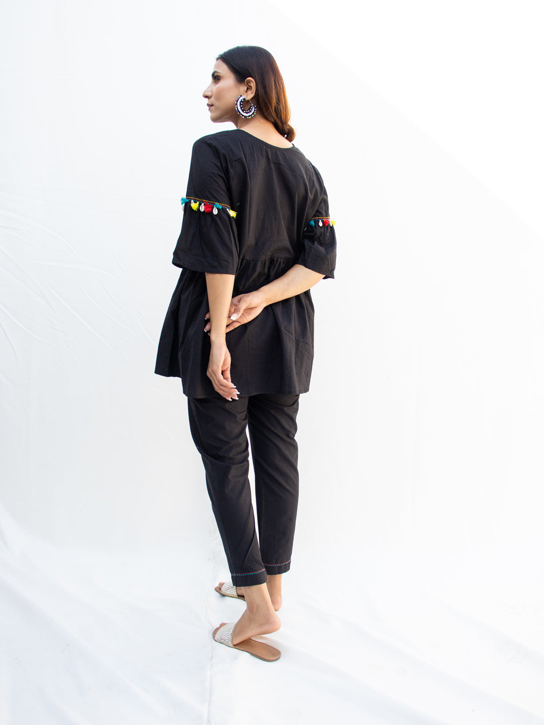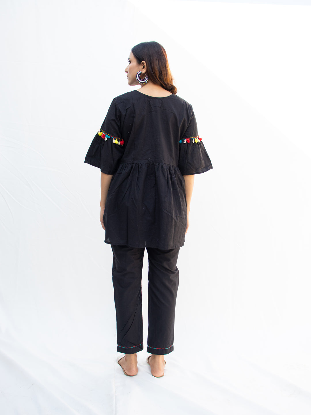 Made from 100% breathable cotton, NYAH features an empire-line kurta with hand-done Katha embroidery, colorful dori work, and joyful kodi tassel detailing across the front and sleeves. The flared cut of the top paired with relaxed-fit pants makes this set as comfy as it is captivating.