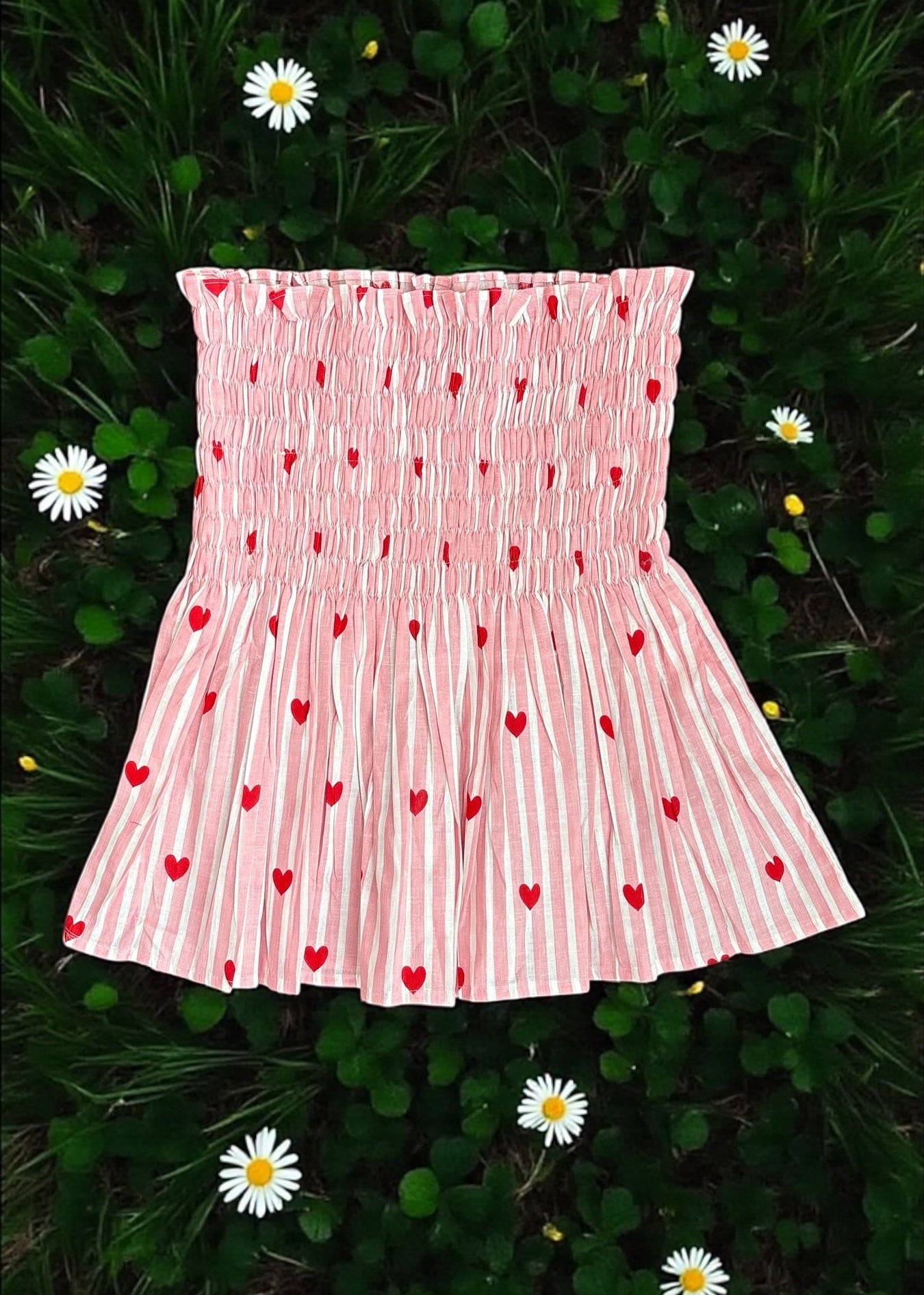 A handcrafted festive set featuring a red striped floral embroidered tote and a red heart-print smocked top. Made with soft cotton and artisanal stitching, this cheerful duo brings together comfort and craftsmanship in a way that feels truly personal.
