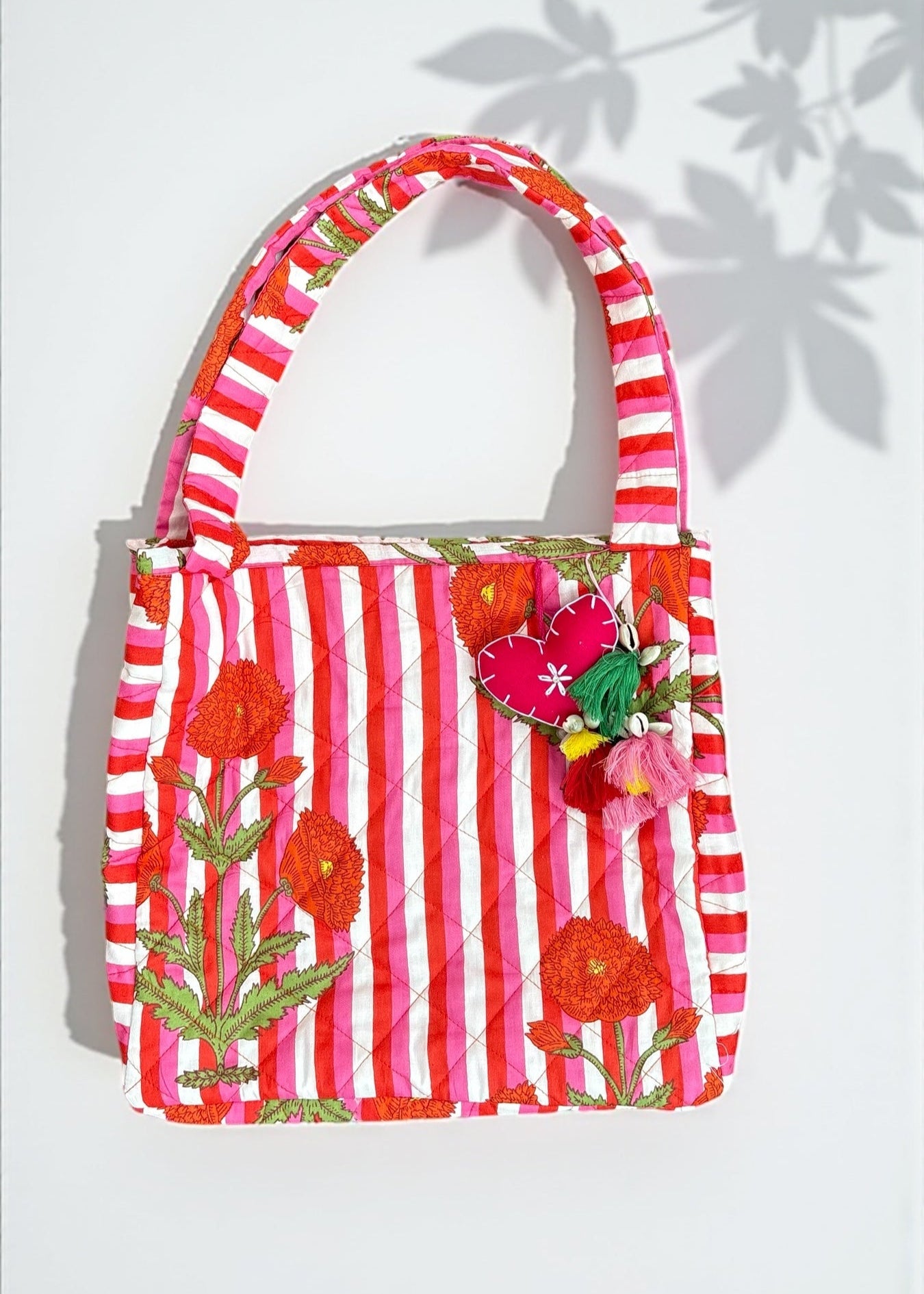 This hamper includes our red heart-print smocked top paired with a quilted striped tote bag, beautifully embroidered with floral motifs and finished with a handcrafted heart charm. The look is bright, bold, and full of festive personality — perfect for gifting or styling your own celebratory moments.
