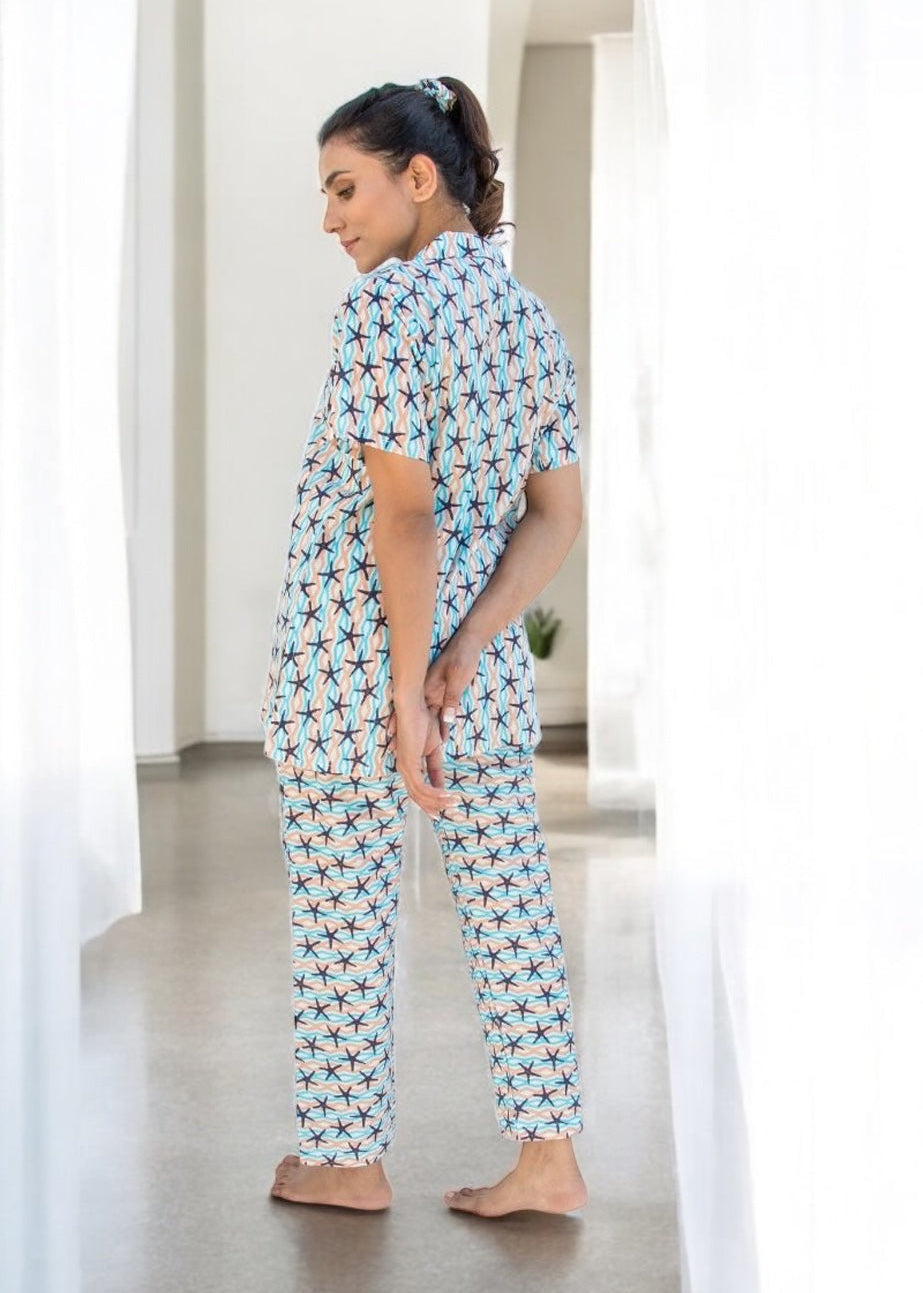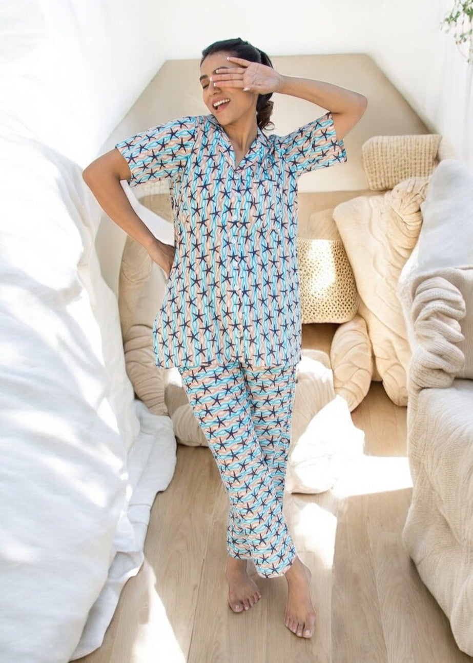 The Starlight Co-ord Set wraps you in coastal charm with its whimsical starfish print and feather-soft cotton. Featuring a classic button-down shirt and relaxed-fit lounge pants, this set brings joy to everyday ease.