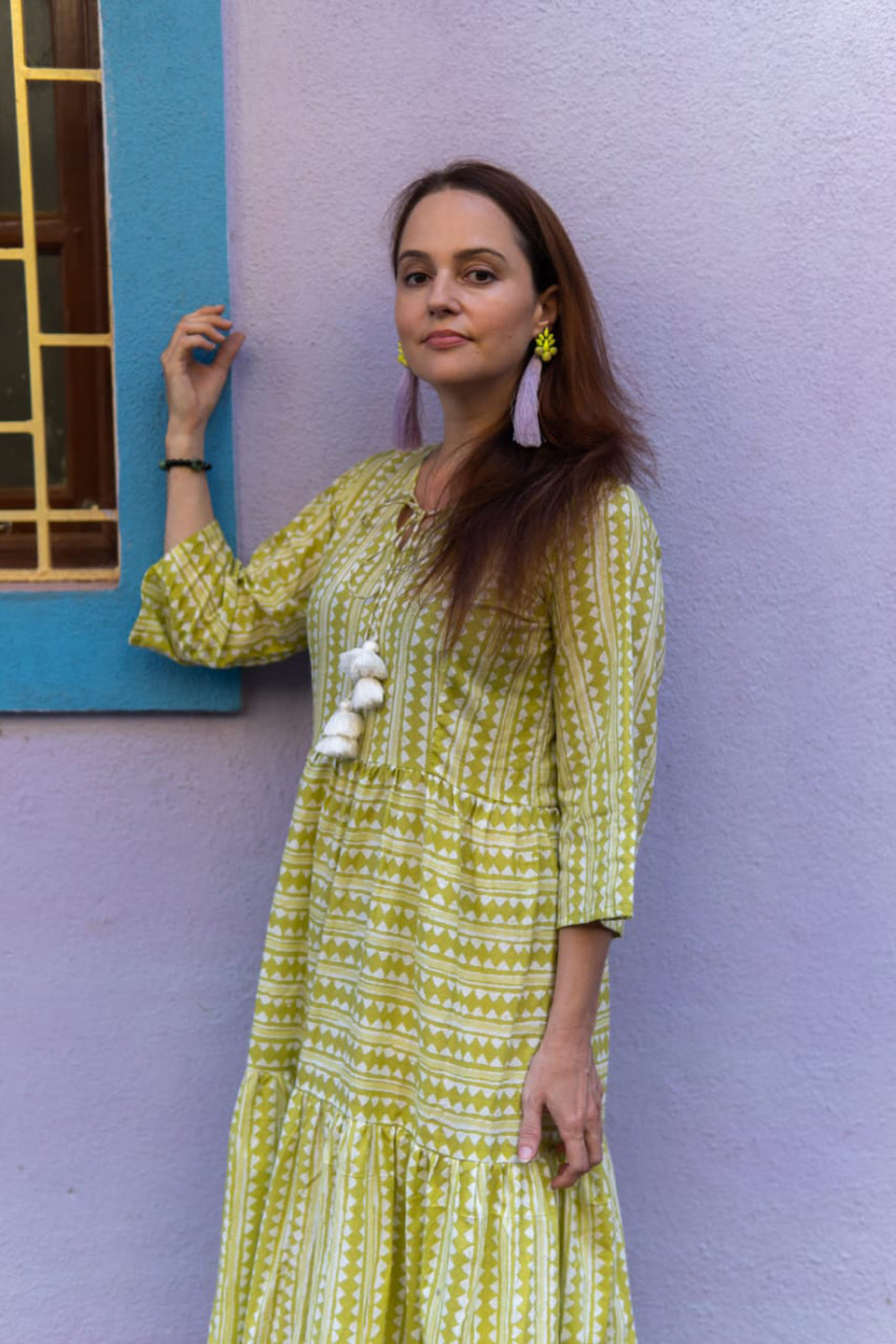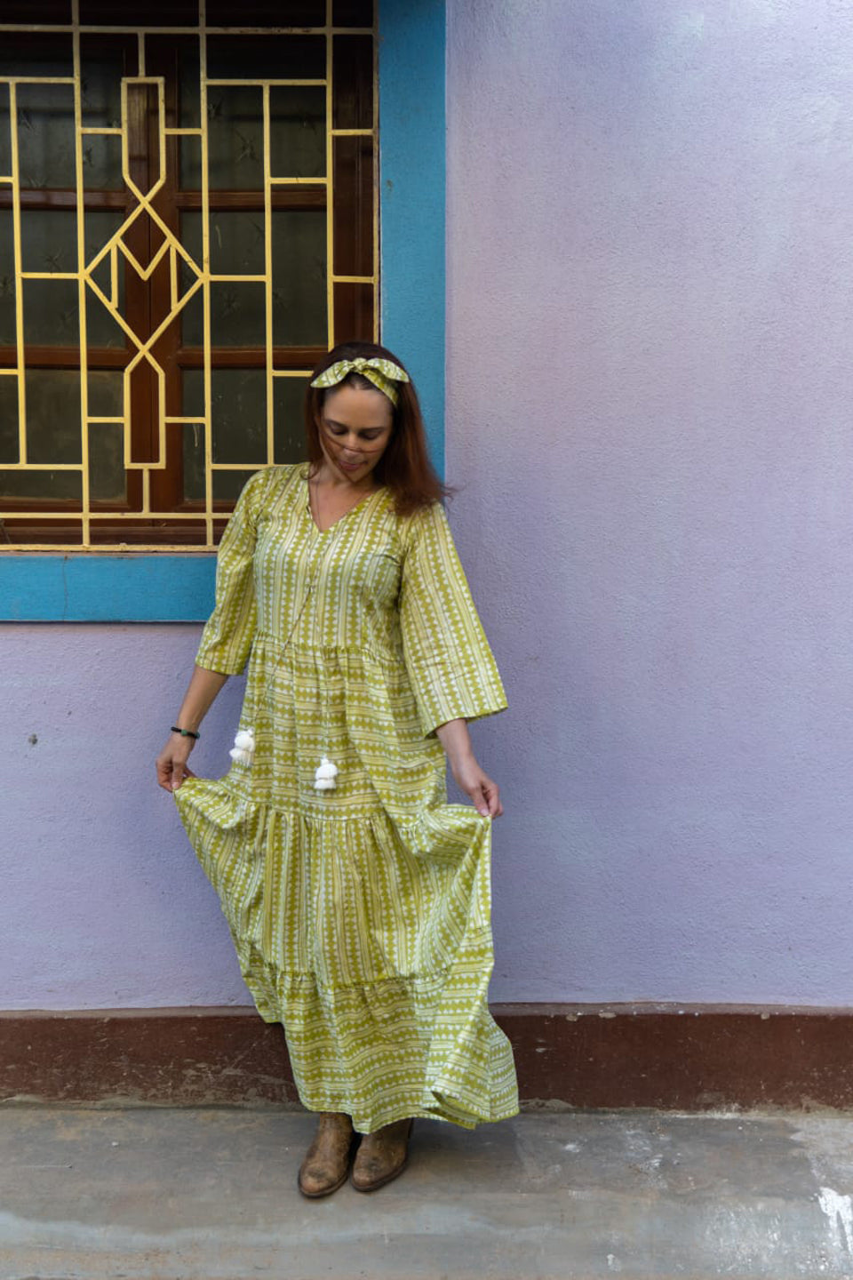 A true people's favorite from our Goan Romance collection, this dress blends cheerful vibes with timeless artistry. Handblock printed on 100% cotton, every dress is unique — no two are ever the same. The breezy tiered silhouette is enhanced with bell sleeves, delicate lace accents, and handcrafted tassels that add a playful yet elegant touch. Perfect for sunny strolls, relaxed brunches, or spontaneous weekend getaways.