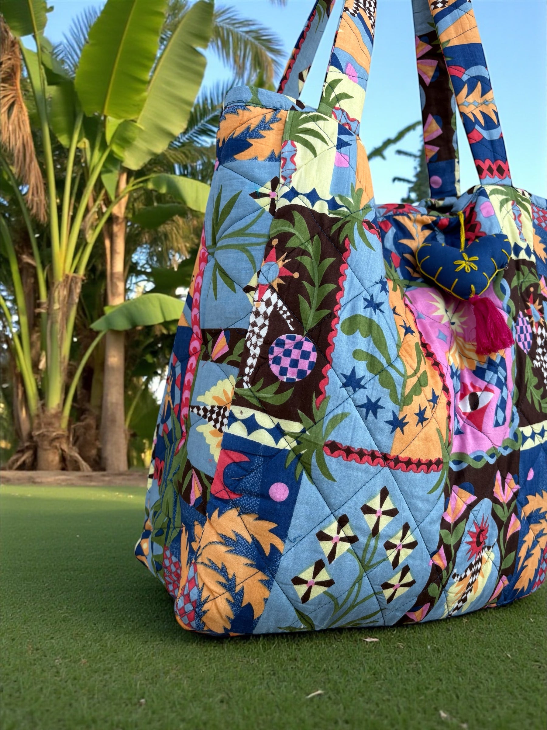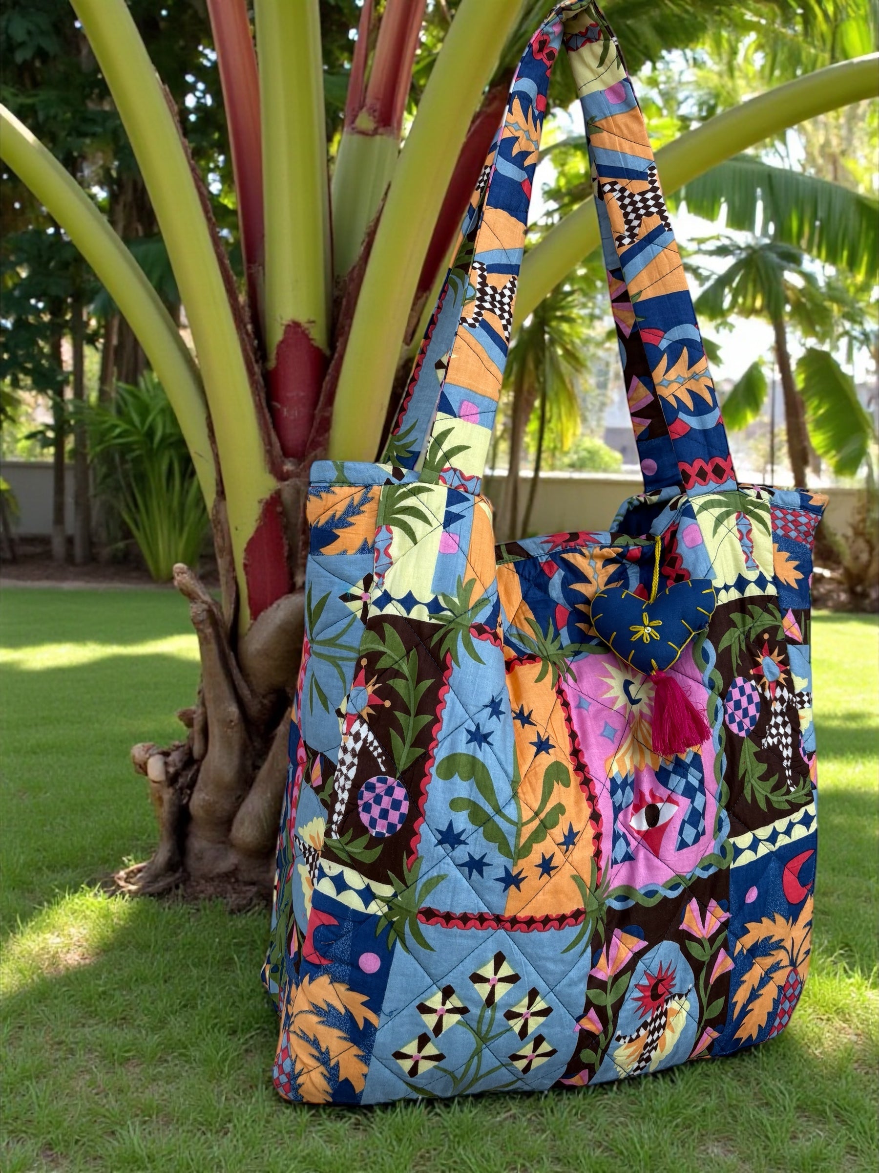 This tote is constructed from quilted cotton panels stitched in a diamond grid, featuring a vibrant mix of tropical leaves, florals, abstract shapes, and geometric prints. The padded shoulder straps offer comfortable all-day wear, while the structured yet soft body holds essentials like books, water bottles, pouches, and daily must-haves with ease. A stitched heart charm with tassel accent adds a playful, handcrafted finishing touch.